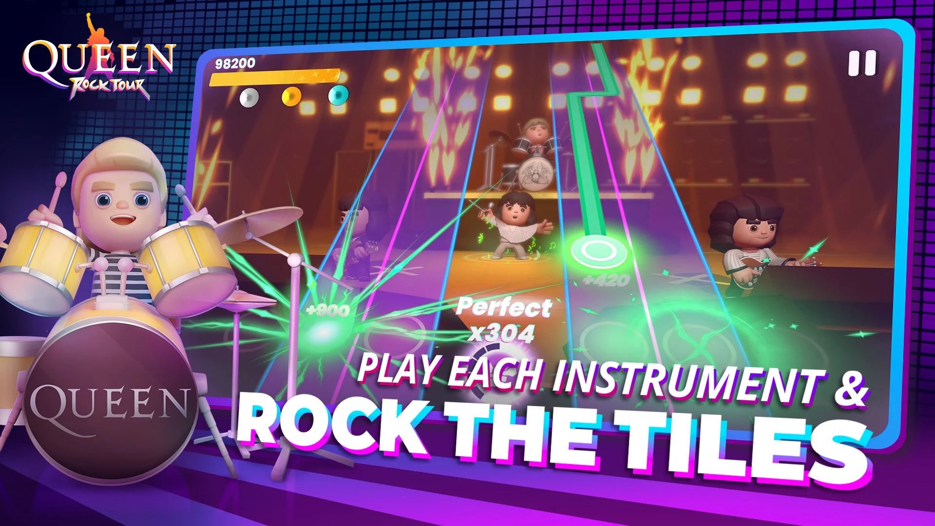 Queen: Rock Tour, 1970 yılında kurulan ve dünyanın belki de en büyük rock grubu olan Queen’in parçalarını çalacağınız oldukça eğlenceli bir mobil oyundur. Oyunda 1974 yılındaki konserden itibaren bütün Queen konserlerini görebilirsiniz. Amacınız konserlere çıkarak Queen grubunun yükselişine kendi gözlerinizle şahitlik etmek. Oyunda konser veriyorsunuz ve Queen grubunu siz yönetiyorsunuz. Bir konsere çıkabilmek için ekranın sağ alt kısmında yer alan butona tıklamanız ve konseri seçmeniz gerekiyor. Konser başladığında ekranın sağ ve sol taraflarında yuvarlak alanlar göreceksiniz. Oyunda başarılı olmak istiyorsanız ritimden kopmamanız gerekiyor. Bunun için de simgeler yuvarlak alanlara geldiğinde ekrana tıklamalısınız. Aynı anda birden fazla simge alanlara temas ediyor olabilir. Böyle bir şey olduğunda iki tarafa da tıklamanız lazım.