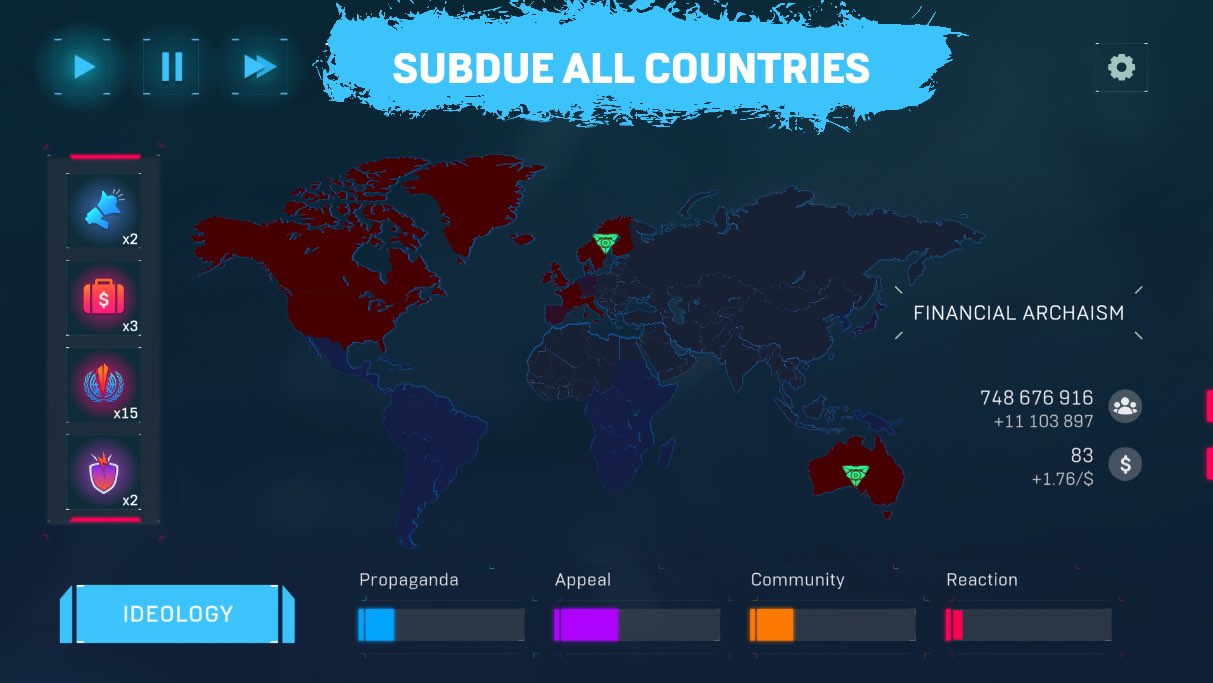 Ideology Rush, kendi ideolojinizi dünyanın her noktasına yaymaya çalışacağınız, politik ve siyasi seçimleriniz ile dünyaya yön vereceğiniz keyifli bir mobil oyundur. Oyunu ana menüde bulunan “Start a game” yazısına tıklayarak başlatabilirsiniz. Sonrasında düşük, orta ve yüksek zorluk seviyeleri arasından seçim yapmalısınız. Zorluk seviyesi arttıkça ideolojinizi insanlara empoze etmeniz de zorlaşacaktır. Örneğin kolay seviyede Amerika ve Çin gibi dünya devlerinin dünya üzerinde kontrolü bulunmuyor. Ancak zorluk seviyesini arttıkça tüm ülkeler ideoloji karmaşasına dahil oluyor. Oyunda ideolojiniz 4 ana başlık altında değerlendiriliyor. Bu başlıklar propaganda, bakış açısı, topluluk ve tepkiler şeklinde sıralanıyor. Eğer ideolojinizi yaymak istiyorsanız propaganda skorunuzu geliştirmelisiniz. Bakış açısı, ideolojinizi benimsemeyen insanların görüşlerini temsil eder.